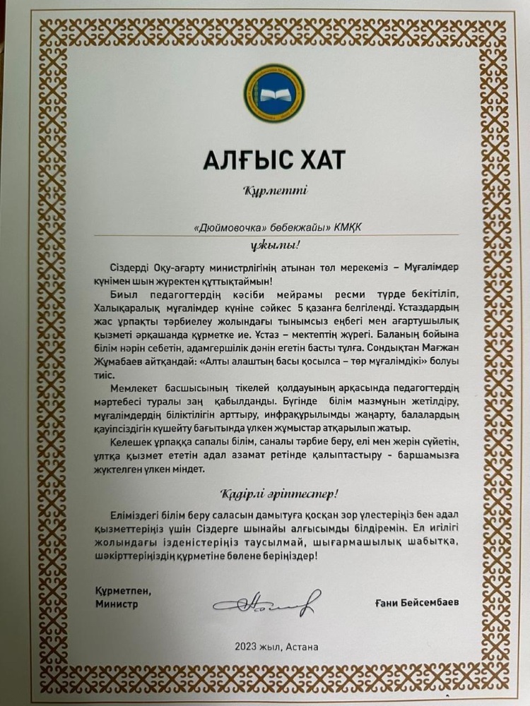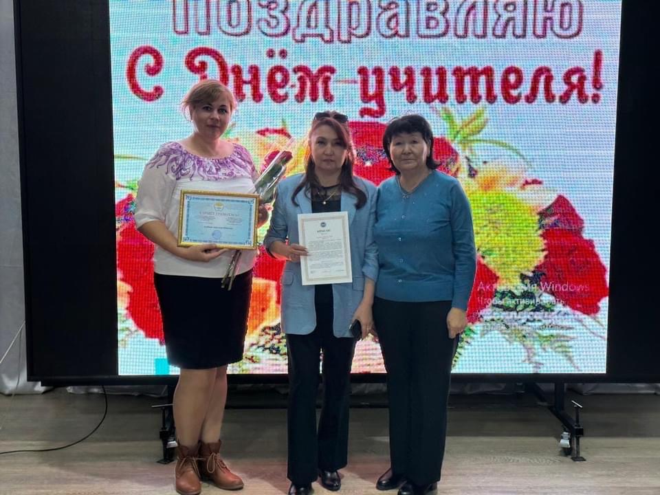 Учитель, как много смыслов в этом слове Оно для каждого человека имеет свою окраску. Учитель занимает особое место в сердце каждого из нас. 5 Октября вся наша страна отмечает День Учителя. Особенно приятно в этот день порадовать наших педагогов поблагодарить их за огромный труд, что они делают для воспитания подражающего поколения. Особенно было приятно отметить, что на торжественном мероприятия посвященный к празднованию Дня учителя наши педагоги ясли сада «Дюймовочка»были награждены грамотами. Благодарственное письмо коллективу ясли сада Дюймовочка от Министра просвещения РК Гани Бейсенбаева, грамоты от председателя профсоюзной организации образования области и района, также грамотами от руководителя отдела образования были награждены воспитатели Агубаева Анастасия Юрьевна и Биржанова Айнур Амангелиевна.Желаем вам и коллективу ясли сада «Дюймовочка» дальше с радостью учить и достигать новых успехов! Будьте счастливы и полны сил и энергии! С праздником Вас дорогие педагоги!
